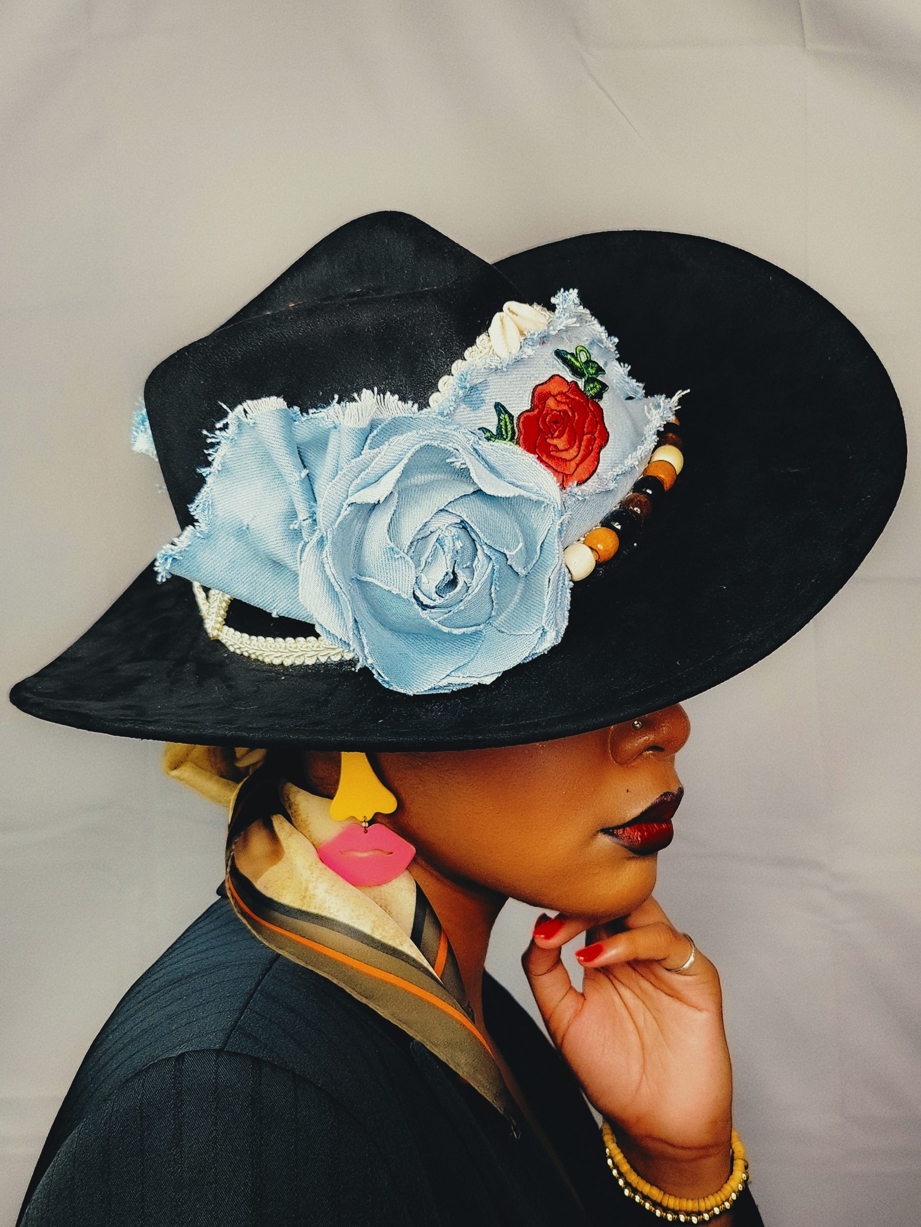 Black cowboy hat customized with light wash denim accents, red rose details, wooden beads, iridescent jewels, and cowrie shells.